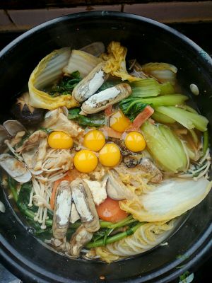 各种蔬菜软后关火,打入鹌鹑蛋。