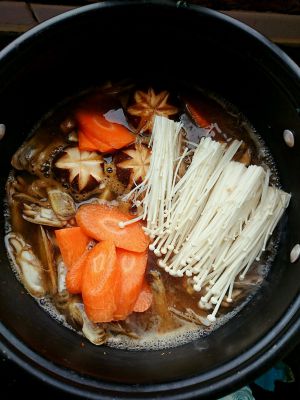 加水放入金针菇和胡萝卜,烧开。