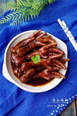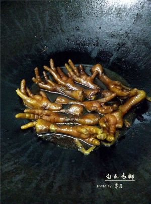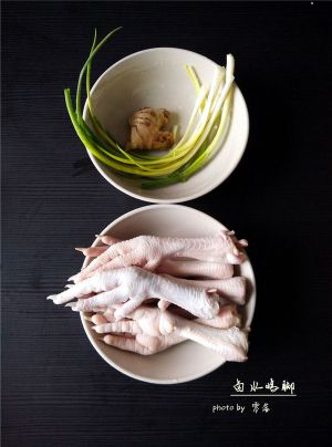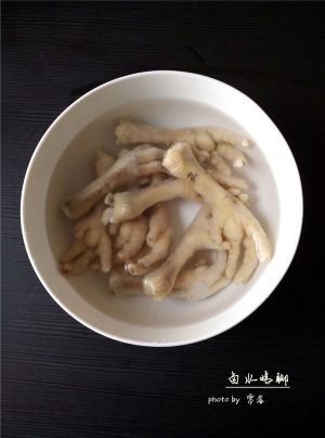 鸡脚剪去脚趾,洗净后,放入煮锅里;再放入清水,姜片,料酒;不加盖,冷水煮开;