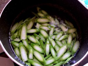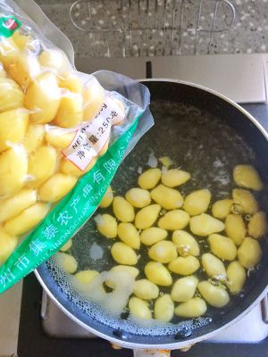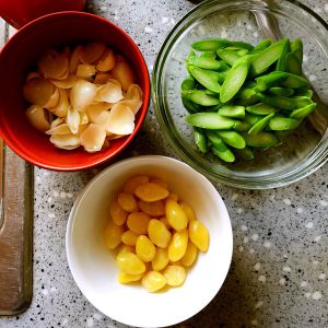 其实原料此时基本都熟了,我们用芝麻油炒制(其实就是扒拉几下),少量油下锅烧微热,中小火,芦笋下锅5秒,之后百合5秒,最后银杏再5秒。关火加鸡精和盐调味,一定要淡。