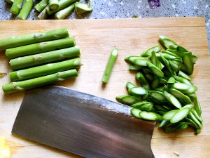 芦笋尖做了培根卷,根部三分之一不要,中段切片。
