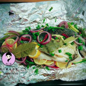 鱼肚子里放葱段姜丝洋葱柠檬塞满,剩余的撒在鱼身上,辣椒和香叶放在鱼身上