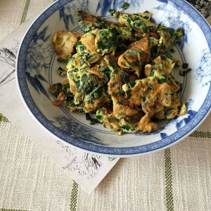 韭菜切碎,放入碗中,打上鸡蛋,加适量盐