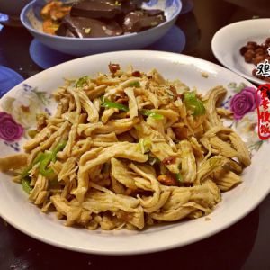 煮熟的鸡脯肉捞出,放入凉水浸泡,冷却后捞出,撕成丝。