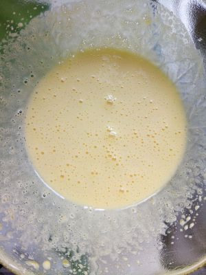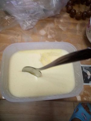 这是煮好的牛奶蛋液,加入20个的炼乳,