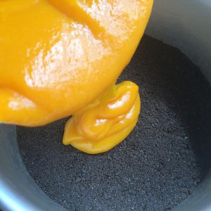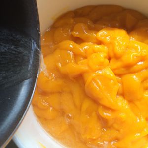 把融合好的吉利丁液倒入芒果中搅拌均匀。