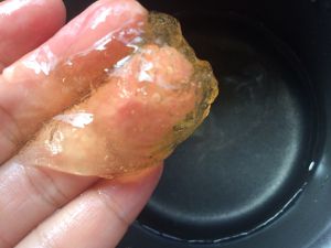 吉利丁片先用冷水泡软,奶锅放入10克水加入泡软的吉利丁片,小火煮至吉利丁片融化。