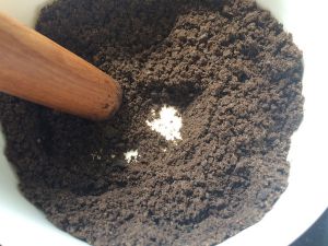 奥利奥饼干取出放入容器中,用擀面杖的一头压碎成细腻状态。