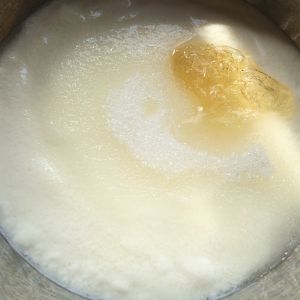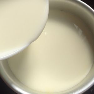 接下来继续制作酸奶慕斯层,同样先把吉利丁片放冷水中泡软,然后先用一半的酸奶放入奶锅中加入30克的细砂糖跟吉利丁片,用小火煮至细砂糖跟吉利丁片融化关火。再倒入剩余的一半酸奶搅拌均匀。
