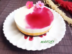 再次从冰箱拿出已经定型好的芒果层,把混合好的酸奶糊倒入模具中,再放入冰箱中冷藏至少4小时,隔夜更佳哦。也还可以做镜面,我没有做,自己随意弄了一些蓝莓汁淋上去。