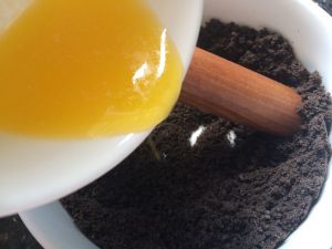 黄油隔热水融化成液体,倒入奥利奥饼干中搅拌均匀。