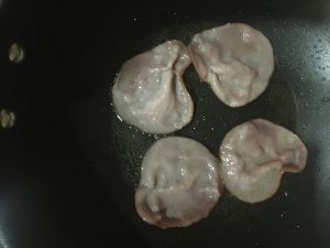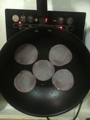 热锅冷油(刚好铺满薄薄一层在不粘锅锅底),电磁炉1300w,放入火腿片