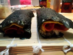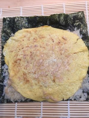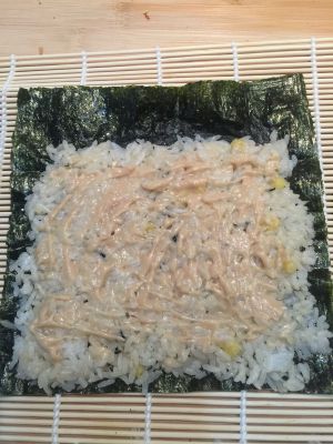 戴着一次性手套将米饭平铺在紫菜上,注意薄厚一致,上方留出3cm左右。在米饭上涂一层照烧味沙拉酱。