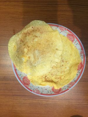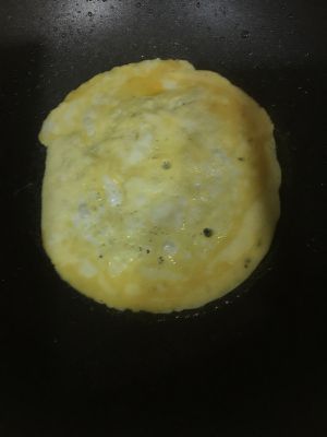 用刚刚煎过火腿的油锅接着煎鸡蛋饼,600w(小火)慢慢煎,要有耐心,不然很容易糊。煎至底层凝固,蛋液微微起泡开始准备翻面