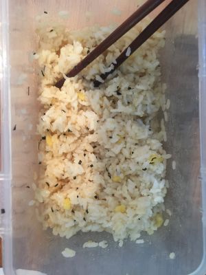 将制作好的寿司醋倒进米饭里,再加入少许味极鲜用筷子拌匀。(我的米饭里还加了玉米薄片和剪碎的海苔)