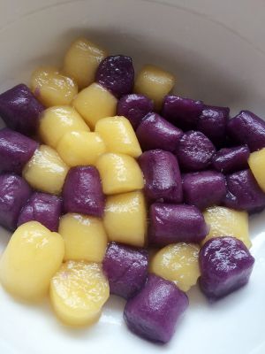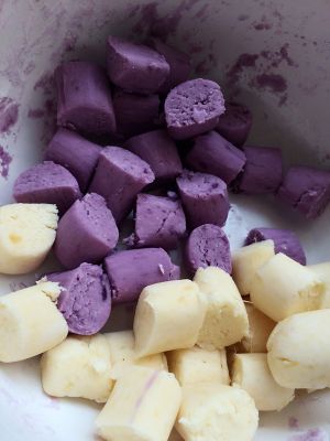红薯,紫薯,分别去皮煮熟,捞起来虑干水分,揉成泥