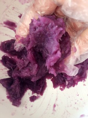 紫薯泥:木薯粉=2:1,100g紫薯泥加50个木薯粉,加5-8g白糖,揉成面团,搓成条,切段