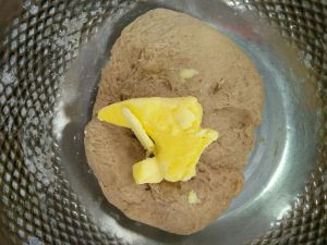 加入黄油继续揉,揉至扩展状态,手套膜状