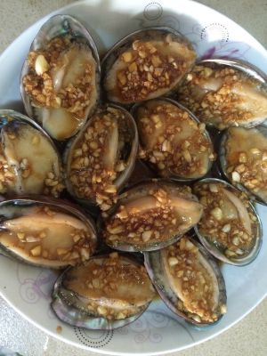 然后热锅热油把蒜蓉葱段爆香后加入少许水烧开后放少少盐和酱油,然后下生粉勾芡,然后倒在鲍鱼上