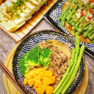 然后将焯水之后的胡萝卜,西兰花,和芦笋放好,肥牛盖好,汤汁浇在饭上。