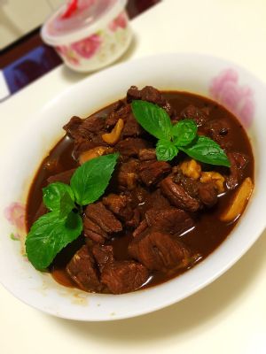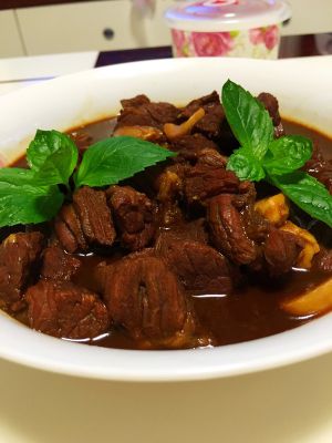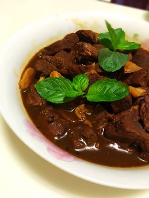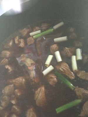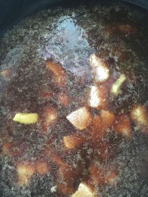 锅中倒入油烧至温热时倒入糖,加热至糖变色至糖浆后倒入能没过牛肉的清水(加水时会迸溅,要及时躲避)