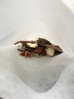 把辅料中花椒、香叶、山楂、大料、桂皮等放入料包(如果有现成的料包,也可以直接用)