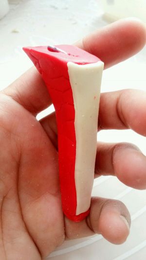 红色干佩斯捏成鞋跟造型,中间插入一根铁丝固定