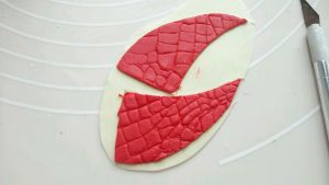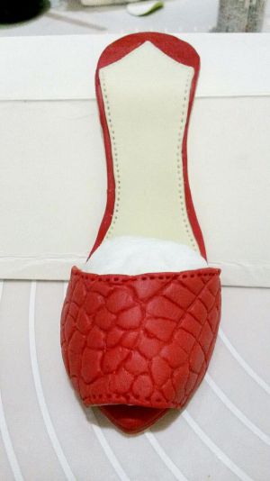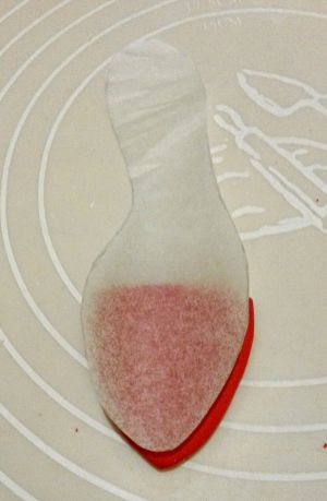 白色干佩斯加大红色素,揉匀后擀成厚为3豪米的厚片,按鞋垫鞋头的大小做好鞋子的防水台