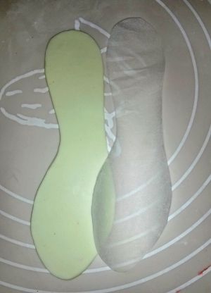 先用油纸画好鞋垫的大小,用剪刀剪好。白色干佩斯加少许黄色揉匀,擀平,按鞋垫纸垫切好2片