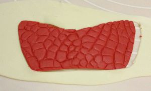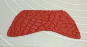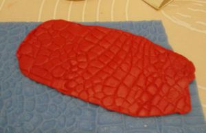 准备一片硅胶的鳄鱼纹模,红色干佩斯擀平后放在鳄鱼纹模上,用擀面杖轻压出纹理