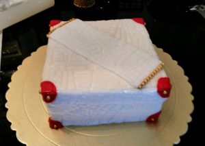 白色翻糖膏擀平,擀薄,后鳄鱼纹模印出纹理,轻轻包住蛋糕胚,抹平。红色干佩斯做好皮鞋盒的点缀