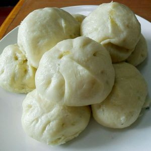 把面团分成一个个小剂子,幹成中间厚周边薄的圆形,放上馅,捏成生胚,放到垫了屉布的蒸锅上。全部完成后,再醒发20分钟,然后冷水旺火蒸18分钟,关火焖5分钟即成。