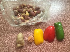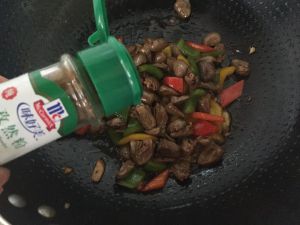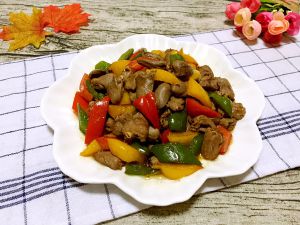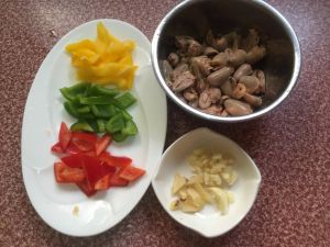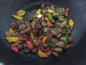鸡心切开两半去除血末和油脂,洗净后用适量的盐、生抽、孜然、料酒抓匀腌制半小时,青红黄椒切小块(跟鸡心一样大小)蒜、姜切碎