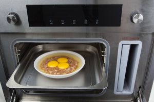 将盘子放入蒸盘,蒸箱预热完成的提示音响后,快速将蒸盘放入蒸箱,关上蒸箱门,待蒸箱工作结束后取出即可。