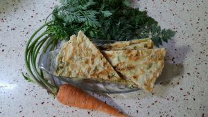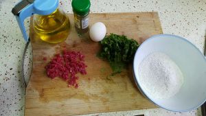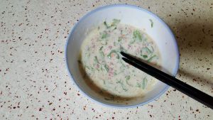 芹菜叶切碎,胡萝卜切碎,加入面粉中,加入水和鸡蛋和牛肉,调入盐和胡椒粉,调成面糊