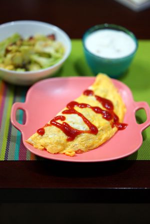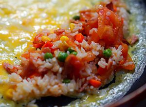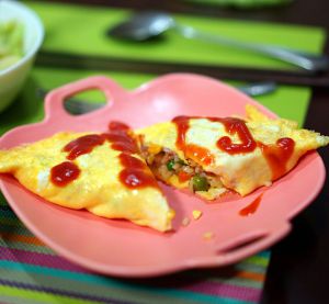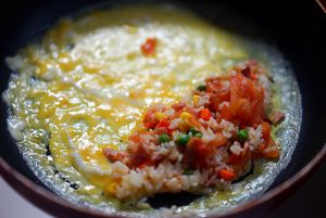 两个鸡蛋打散,入平底锅摊成饼状,鸡蛋半熟的时候将米饭放入一半的位置,轻轻将另一半对折,用汤匙按压边缘