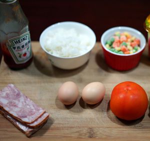 起油锅分别加入培根粒、杂菜粒、米饭,翻炒均匀,倒入前面炒好的番茄酱,加盐调味。
