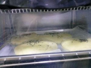 分成剂子,揉圆,放烤盘,用手摁扁,烤箱180度预热。