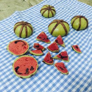 将绿色的收口,然后巧克力色的方形条交错放在绿色圆形面团上面。小西瓜就做好了。