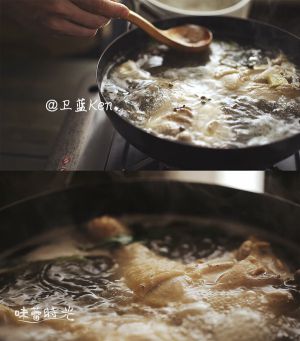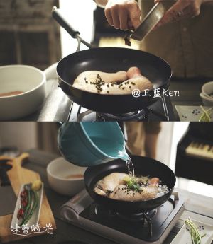 洗净的鸡腿放入锅内,倒水没过鸡腿,加入丁香,香叶,八角,姜片,藤椒,葱束,料酒,海盐,开火煮开。