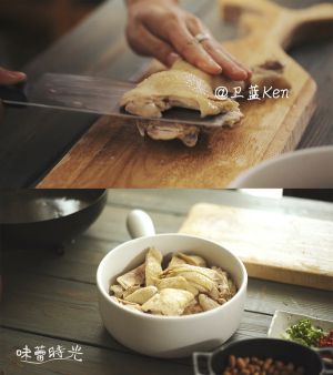 往装有藤椒油的小锅内盛入几勺鸡汤,少许细盐,小米椒碎和杭椒碎,花生碎(油炸后剁碎),姜蒜末,香油(少量或不放),搅拌均匀,制成酱汁。