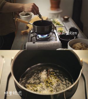 取一小锅烧热,倒入食用油,油热后放入藤椒,然后关火制成藤椒油待用(亦可买现成的藤椒油)。