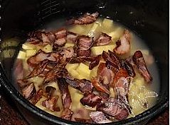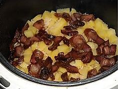 把土豆丁、拉肉片铺在米的上面,按下煮饭键;