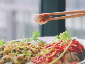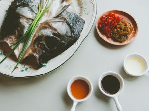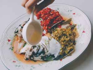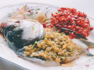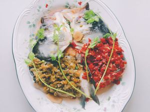 取出蒸熟的鱼头,轻轻倒出盘里的汤汁(可用滴管、厨房用纸吸干),撒上葱丝、香菜做点缀。