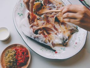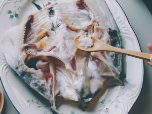 鱼头内部抹上少许盐,可以让内部的鱼肉有底味。