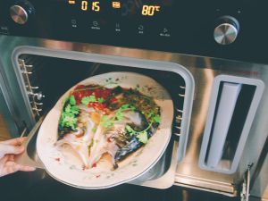 预热蒸箱,选择“蒸鱼”模式,设置100℃,定时15分钟。