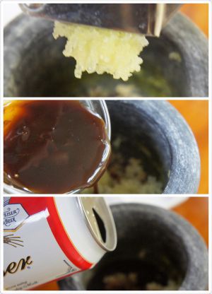 挤入一个大蒜,加入红糖膏和啤酒,调成膏状。