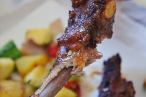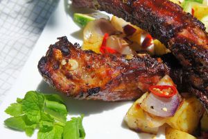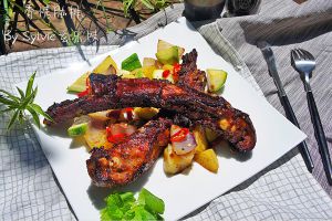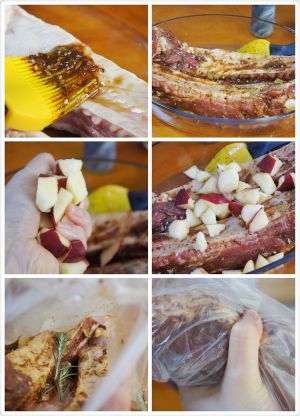 用刷子把调料膏均匀的涂抹在肋排上。把苹果切小块,用手挤一挤,出点苹果汁,和肋排一起放在保鲜袋里,分布均匀,再将迷迭香也放进去。排出空气,用手轻轻捏一捏,像给排骨做按摩~之后放入冰箱0度保鲜过夜。