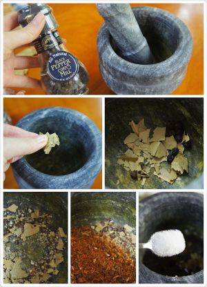 黑胡椒可以用磨碾器,也可以像我一样用捣臼。把月桂叶卷起,揉捻碎,和黑胡椒一起捣,再加入辣椒粉,孜然,白芝麻,和6g盐,大约3小勺。