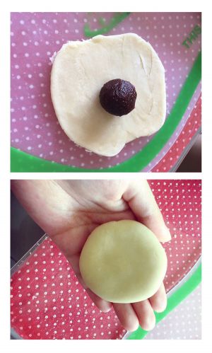 将每个油皮擀开,包紧油酥,封口朝下放置8分钟